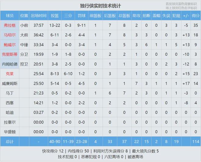克莱、哈迪和凯莱布-马丁,上半场合计8中0!幸亏独行侠替补席还有布兰登-威廉姆斯,他半场9中5砍下12分2助攻。伦纳德和科林斯上半场合砍14分,哈登12分6助攻3失误。半场战罢,快船56-49领先7分,独行侠三分20中2!