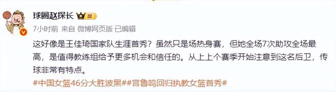 而另一个新人,也就是后卫线的王佳琦单场贡献了7次助攻,是昨晚中国队助攻次数最多的队员。虽然她进攻端没有得分,但是从表现看,要比老将王思雨和李缘好多了,后面两人运动战同样不得分,助攻也没有王佳琦多。媒体人赵探长夸了她,“这好像是王佳琦国家队生涯首秀?虽然只是场热身赛,但她全场7次助攻全场最高,是值得教练组给予更多机会和信任的。从上上个赛季开始注意到这名后卫,传球非常有特点。”